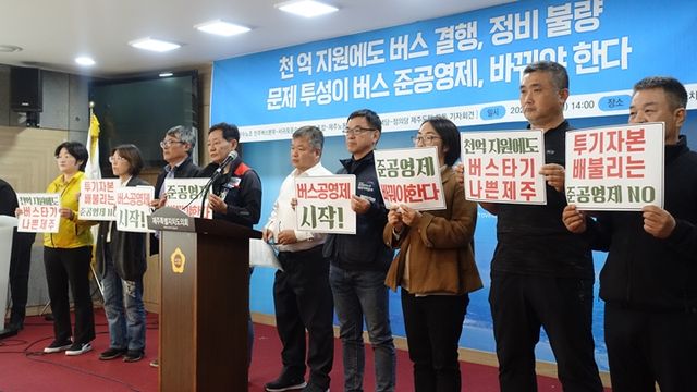 민주노총공공운수노조민주버스본부 제주지부와 서귀포운수협동노동조합, 제주노동자연합, 제주녹색당, 정의당제주도당은 18일 제주도의회 도민카페에서 기자회견을 열고 "1000억 지원에도 버스 결행, 정비불량 등 문제 투성이인 준공영제를 바꿔야 한다"고 주장했다.