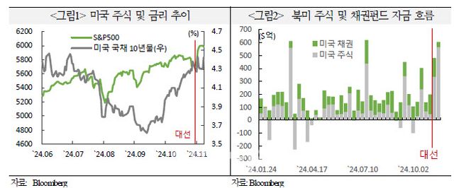 트럼프 전 대통령 당선 이후 미국 국채 금리와 달러화 가치는 급등하고, 주식시장은 미국만 나홀로 강세를 보이고 있다. 미국채 10년물 금리는 9월 고용지표 회복과 트럼프 전 대통령 당선 전망에 따라 10월 이후 67bp(1bp=0.01%포인트) 급등했고, 달러화는 5.7% 강세를 보였다. 특히 미국 주식시장은 대선 전후로 3.9% 오르며 대부분 국가들에서 약세를 보였던 것과 반대 흐름을 보였다.