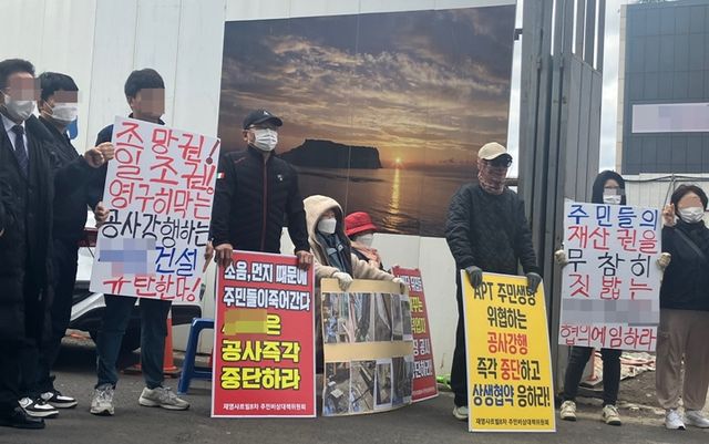 제주시 노형동의 한 숙박시설 공사를 둘러싸고 인근 아파트 주민들이 소음, 분진 등 피해를 호소하며 집단행동을 하고 있다.
