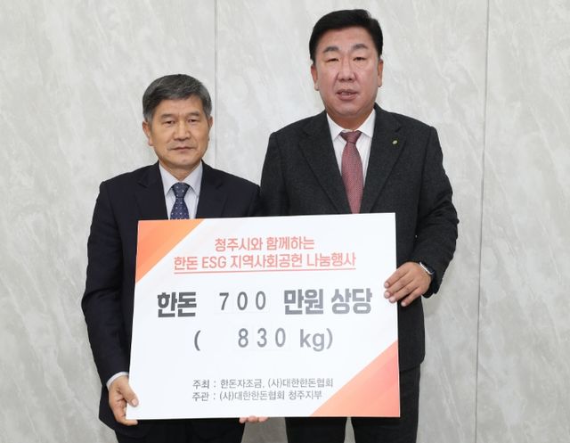 이날 오전 임시청사 직지실에서 진행된 기탁식에는 이범석 청주시장과 노가열 (사)대한한돈협회 청주시지부장이 참석했다.