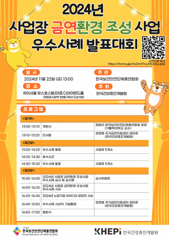 한편 발표대회에는 사업장 금연환경 조성 사업에 관심 있는 임직원 누구나 참석 가능하며 우수사례 발표대회 포스터의 QR코드를 스캔하거나 한보총으로 21일까지 직접 신청할 수 있다(문의처 02-3147-8572, 02-6952-9101).