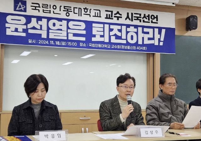 안동대 전·현직 교수 33명은 18일 기자회견을 열고 “전쟁 위기 조장과 대일 굴종 외교, 외교 참사, 의료대란, 민생 파탄, 김건희 여사 국정농단을 지켜보는데 인내의 한계점에 도달했다”며 “명태균의 여론조사 조작, 공천 개입 등을 지켜보는 교육자로서 더 이상 인내할 수 없다”고 밝혔다.
