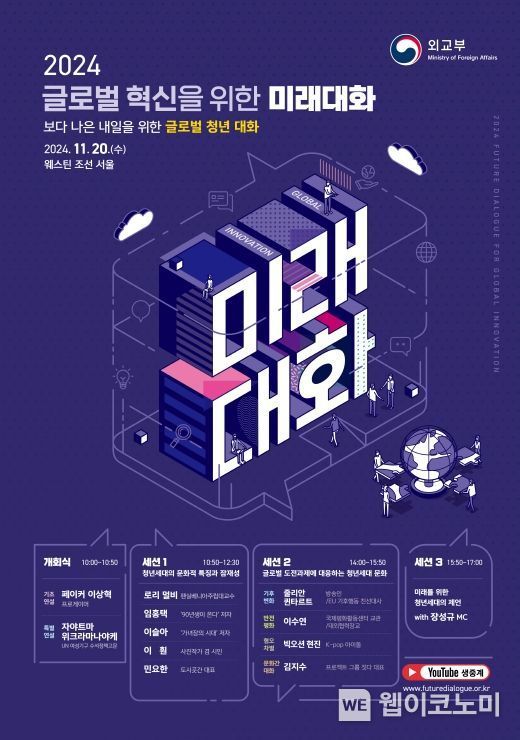 (웹이코노미) 외교부는 11월 20일 서울(웨스틴 조선 호텔)에서 ‘보다 나은 내일을 위한 글로벌 청년 대화’라는 주제로 2024년 글로벌 혁신을 위한 미래대화를 개최한다.