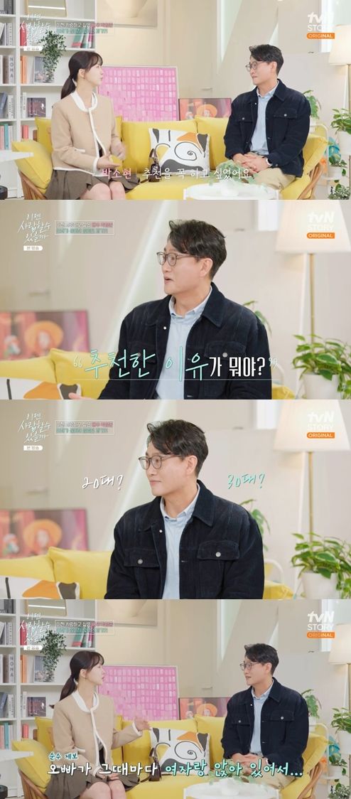 그는 "여기 추천해줘서 오긴 왔는데, 날 추천한 이유가 뭐냐"라고 궁금해했다. 이에 박소현은 "추천해주고 싶었다. 왜냐면 제가 20, 30대 때 강남에서 오빠를 봤었다. 그때마다 여자랑 앉아있고 그래서 당연히 그분들 중 한 분과 결혼할 줄 알았다"라고 깜짝 폭로했다.