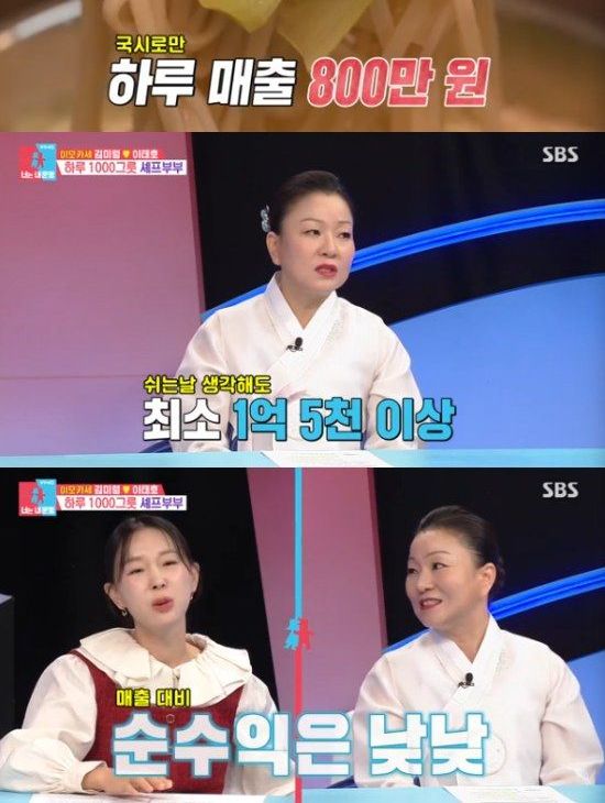 그리고 자막을 통해 하루에 1000그릇 정도 팔린다고 설명을 했고, 국수 한 그릇에 8000원으로 하루 매출이 약 800만원, 월 수익은 1억 5천만원 정도라고 표시됐다. 이에 김미령은 "매출이 그렇다는 거다. 순수익은 그것보다 낮다"고 덧붙였다.