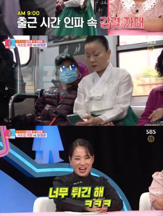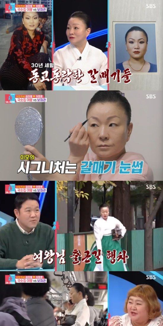 김미령은 트레이드 마크인 레드립과 갈매기 눈썹을 그린 후, 한복을 입고 지하철을 타고 출근을 했고, 저절로 사람들의 시선을 강탈했다. 김미령의 비주얼을 본 김구라는 "무속인으로 오해를 할 수도 있을 것 같다"고 말해 공감을 유발했다.