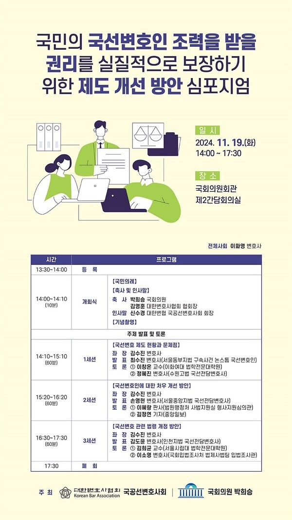 [내외일보] 이수한 기자 = 대한변협 국공선변호사회(회장 신수경)는 국회의원 박희승 의원실과 함께 2024년 11월 19일(화) 14시, 국회 제2간담회의실에서 “국민의 국선변호인 조력을 받을 권리를 실질적으로 보장하기 위한 제도 개선 방안 심포지엄”을 공동으로 개최한다.