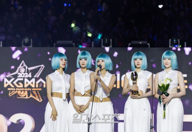 [2024 KGMA] '2024 코리아그랜드뮤직어워즈(KGMA)' 첫째날 행사가 16일 인천 중구 운서동 인스파이어 아레나에서 열렸다.일간스포츠(이데일리M)가 주최하고 KGMA 조직위원회가 주관하는 '2024 KGMA'는 올해 창간 55주년을 맞은 일간스포츠가 대한민국 대중음악계에 새로운 패러다임을 제시하기 위해 새롭게 개최하는 시상식으로 16, 17일 이틀간 펼쳐진다. 그룹 뉴진스가 '2024 코리아그랜드뮤직어워즈(KGMA)' 첫째날 아티스트데이에서 2024 그랜드 아티스트상을 수상하고 수상소감 말하고 있다.영종도(인천)=KGMA특별취재반 /2024.11.16/