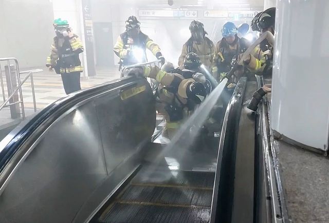 18일 오후 9시 40분께 서울 종로구 지하철 4호선 동대문역 9번 출구 에스컬레이터에서 불이 나 출동한 소방대원들이 화재를 진압하고 있다. / 종로소방서 제공