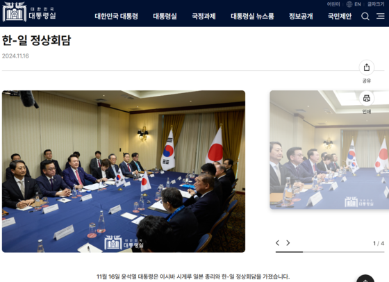 아시아태평양경제협력체(APEC) 정상회의 참석차 페루를 방문 중인 윤석열 대통령은 16일(현지시간) 오후이시바 시게루일본 총리와 50분 간한일 정상회담을 가졌다.