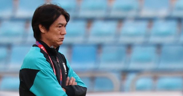 11회 연속 월드컵 본선 진출을 도전하고 있는 한국 축구 국가대표팀의 홍명보 감독이 2026 북중미 월드컵 아시아 3차 예선 B조 6번째 경기인 팔레스타인 전을 하루 앞두고 18일 오후(현지 시각) 요르단 암만 국제경기장에서 열린 공식 훈련에 앞서 생각에 잠겨 있다. / 연합뉴스