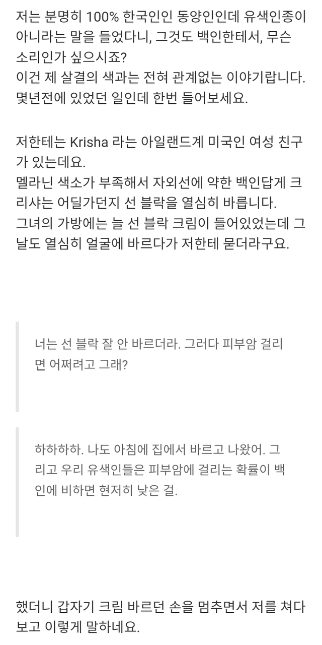실제로 한국인의 피부색은 남유럽 백인과 비슷하다고 함(원주민 기준)