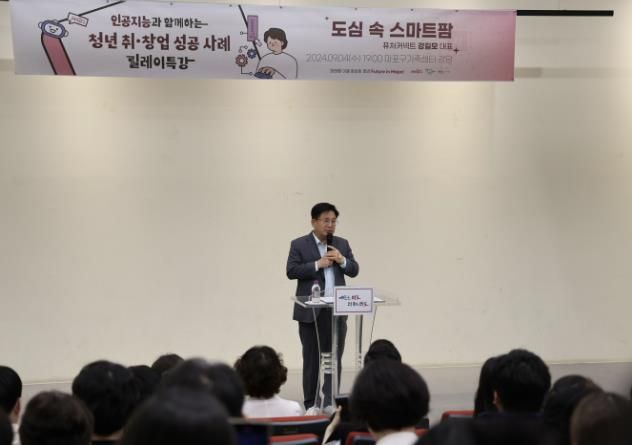 | ▲ 9월 4일 박강수 마포구청장이 인공지능과 함께하는 취창업 성공사례 릴레이 특강 참여자들에게 응원의 메시지를 전하고 있다. |