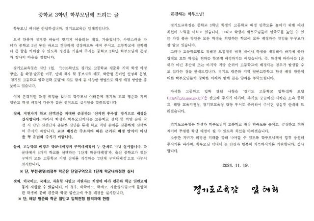 도교육청은 이번 서한문 배포로 다음 달 원서 접수를 앞둔 중3 학부모의 경기도 평준화 지역 학생 배정 방안에 이해를 돕고 학교 지망 순위 작성에 신중을 기하는 것에도 도움이 될 것을 기대하고 있다.