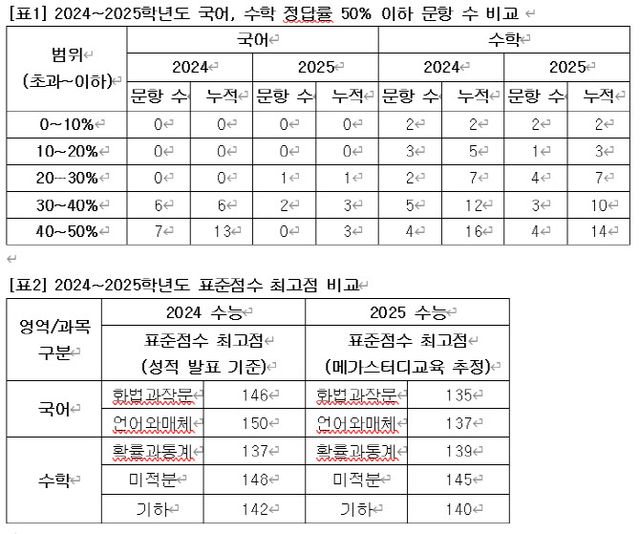 19일 메가스터디교육은 수능 당일(14일)부터 18일까지 자사 채점서비스를 이용한 84만여건의 데이터를 바탕으로 2025학년도 수능 문항 정답률을 분석했다. 그 결과 국어·수학 영역 에서 정답률 50% 이하 문항은 지난해 29개에서 올해 17개로 41.4% 감소했다고 밝혔다.