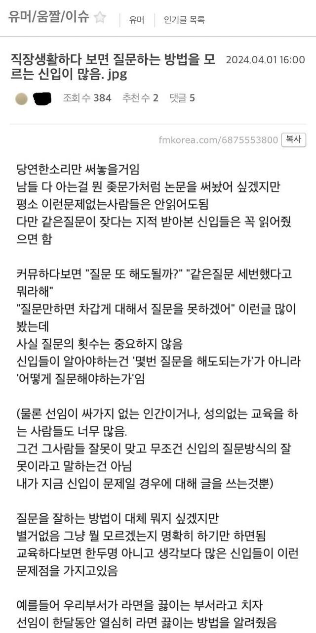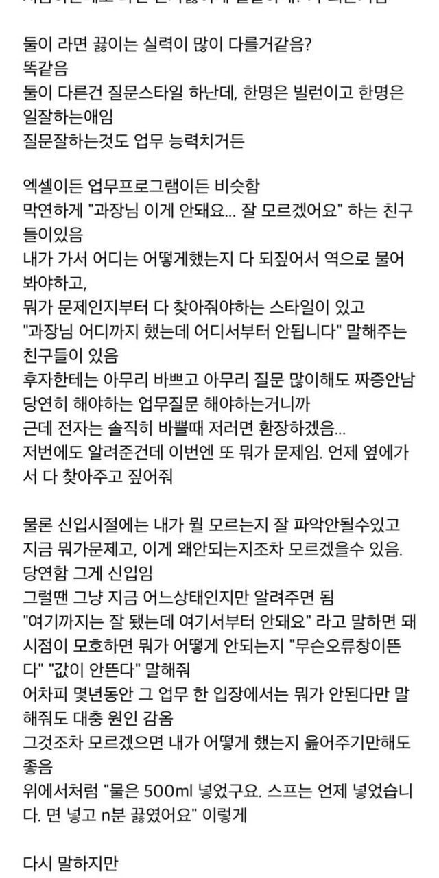 직장생활하다 보면 질문하는 방법을 모르는 신입이 많음.