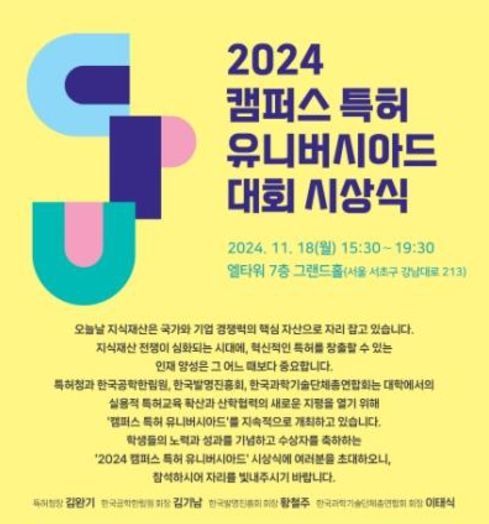[와이뉴스] 특허청은 11월 18일 15시 30분 엘타워(서울시 서초구)에서 '2024 캠퍼스 특허 유니버시아드(Campus Patent Universiade, ‘CPU’)' 시상식을 개최했다고 밝혔다. 최고상인 대통령상은 숭실대 ‘소중한77’ 팀에, 국무총리상은 한국기술교육대 ‘mozada24’ 팀에 각각 돌아갔다.