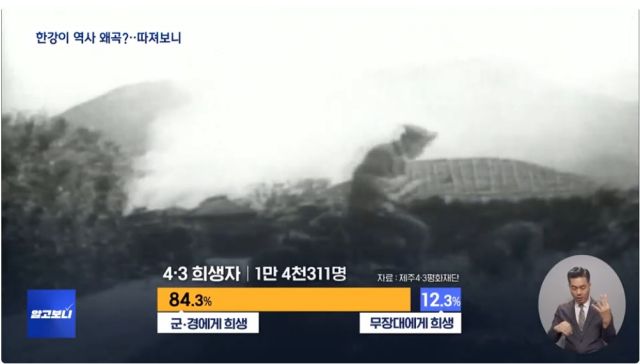 또 "제주 4.3을 소재로 한 <작별하지 않는다>"에 대해서도 "정부가 공식적으로 확정한 4.3 희생자만 1만4000여 명"이었다며 "이 가운데, 군인과 경찰 토벌대에게 희생당한 경우가 84.3%였고, 무장대로 인한 피해는 12.3%였다"고 했다. 그러면서 "당시 순수한 시민이 경찰에 희생당했다는 한강 작가 소설의 배경은 역사적 사실에 부합한다"고 했다.