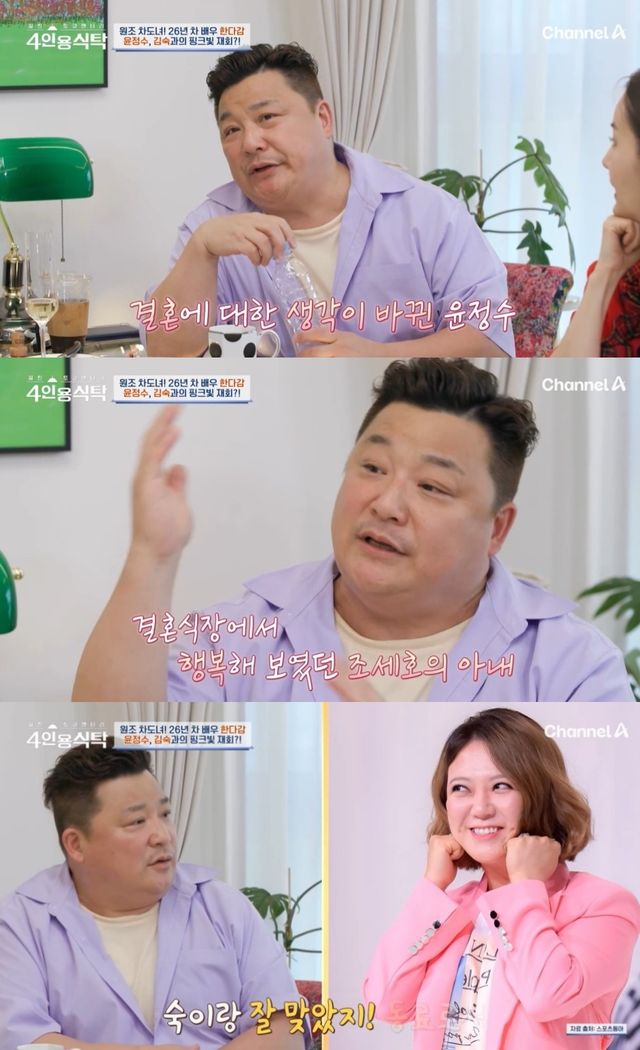 세 명의 유부녀와 다르게 홀로 미혼인 윤정수는 결혼에 대한 질문을 받자 "이제는 안 되면 꼭 해야한다는 생각을 갖고 있지는 않다"면서 지난달 참석했던 조세호의 결혼식을 언급했다.