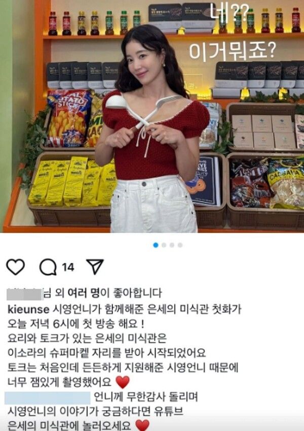 함께 공개된 사진에는 배우 기은세가 10월에 올린 SNS의 글이 담겼다. 당시 기은세는 "시영언니가 함께해준 은세의 미식관 첫화가 오늘 저녁 6시에 첫 방송한다"며 "요리와 토크가 있는 은세의 미식관은 이소라의 슈퍼마켙 자리를 임대 받아 시작됐다"고 적으며 그 동안 이소라가 진행했던 유튜브 채널 자리를 맡아 한다고 전했다.
