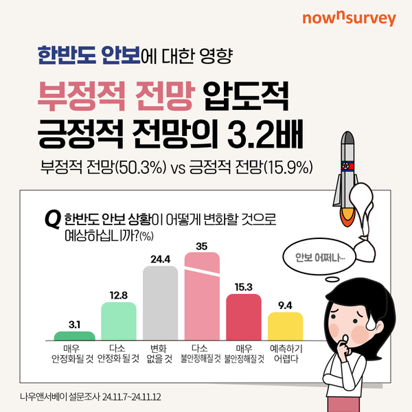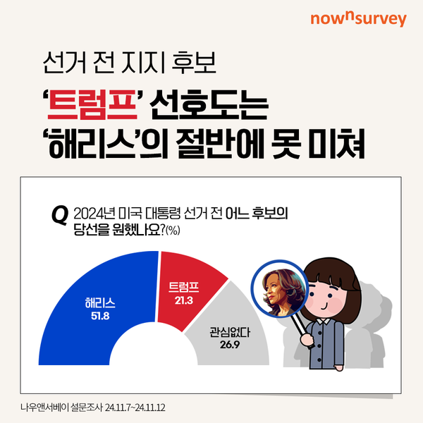 이번 조사는 11월 7일부터 12일까지 나우앤서베이 전국 패널을 대상으로 실시되었으며, 총 응답자는 1,000명(남성 554명, 여성 446명), 표본오차는 95% 신뢰수준에서 ±3.10%포인트이다.