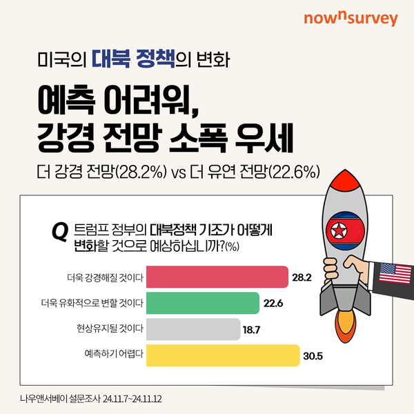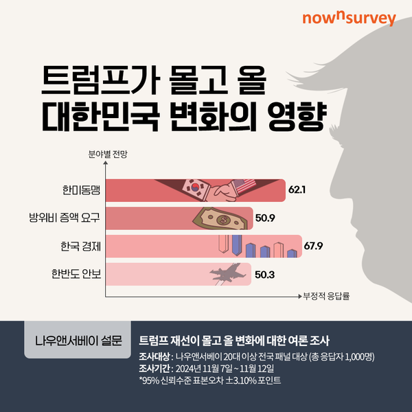이에 엘림넷 나우앤서베이는 트럼프의 재등장이 한국과 국제 사회에 미칠 영향을 예측하고 대응 방안을 모색하기 위해 ‘트럼프 재선이 몰고 올 변화’라는 주제의 설문조사를 실시했다.