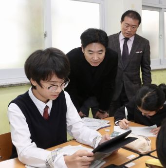 | ▲ 김대중 전남교육감과 관계자들이 공존교실 수업 현장을 참관하고 있다. |