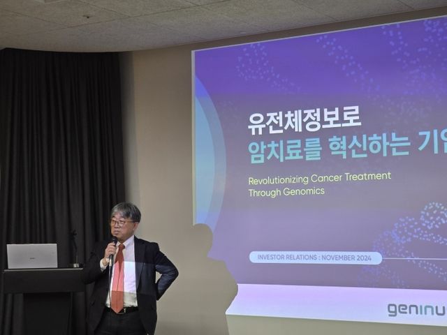 박웅양 지니너스 대표이사가 18일 서울 영등포구 파크원타워2에서 열린 기자설명회에서 발표하고 있다. 사진=이병현 기자