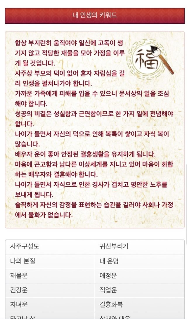 온라인 사주 전문 사이트 '위키사주'는 오랜 전통을 바탕으로 한 사주팔자와 현대적인 분석 기술을 결합하여 각자의 운명을 상세히 분석한다. 이름과 생년월일, 태어난 시간과 성별을 입력하면 간단하게 이용할 수 있다. 특히, 앞으로 3년 동안의 애정을 꿰뚫어볼 수 있는 애정운, 냉정하고 속시원한 궁합, 사랑에 관한 모든 것을 담은 타로까지 다양한 운세를 재미있게 점칠 수 있다.