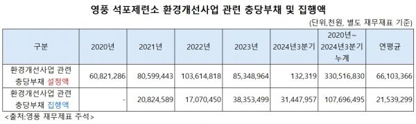 영풍은 2020년부터 환경 개선 사업을 위한 충당부채를 설정한 뒤, 이듬해인 2021년부터 집행하기 시작했다. 올해까지 합산 사용액은 약 1077억 원으로 연평균 270억 원 수준이다. 이 기준으로 보면 '매년 1000억 원 이상 환경 개선 사업에 투자했다'는 영풍의 해명은 앞뒤가 다른 과장된 것이라는 평가가 나온다.