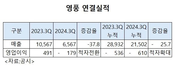 이달 14일 공시한 사업보고서에 따르면 영풍은 올해 3분기 연결 기준 매출액은 6567억 원으로 전년 동기 대비 38%(3999억 원) 감소했다. 같은 시기 영업이익은 마이너스(-) 179억 원으로 전년 동기 대비 적자 전환했다. 올 3분기 말 공장 가동률은 53.4%로 역대 최저 수준으로 떨어졌다. 실적 관련 모든 수치가 악화하면서 경영 정상화가 시급하다는 비판을 받았다.