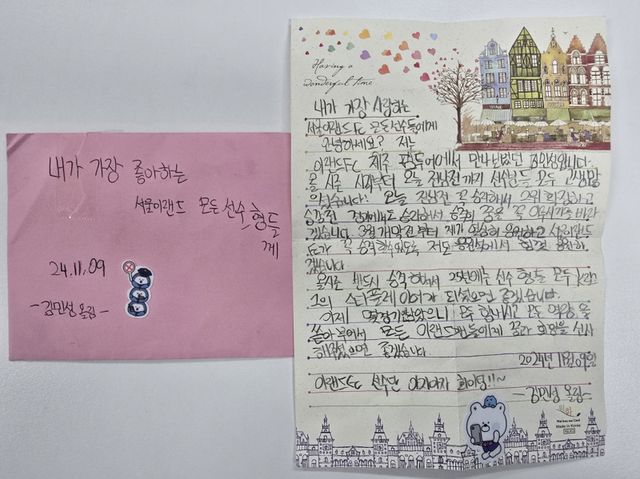 김민성 군은 손수 작성한 편지에서 “서울 이랜드가 승격할 수 있도록 3월 개막전부터 열심히 응원해 왔다. 올 시즌 반드시 승격해서 25년에는 선수 형들 모두 K리그 스타 플레이어가 되었으면 좋겠다. 모든 역량을 쏟아부어서 팬들에게 꿈과 희망을 선사해 줬으면 좋겠다”며 구단과 선수들에 대한 깊은 애정을 표현했다.