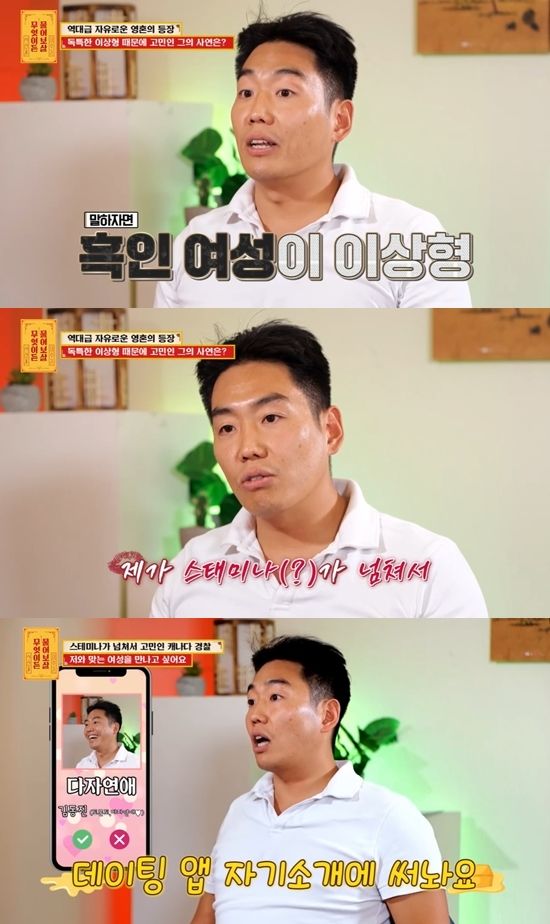현재 캐나다에서 경찰로 근무 중이라고 밝힌 사연자는 집과 차, 가족, 직업 모두 완벽한데 이상형이 독특해 조언을 얻고자 왔다고 밝혔다. 그가 밝힌 이상형은 피부 톤이 어두운 흑인 여성. 외국 배우 조 샐다나가 이상형이라고.