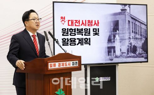 이장우 대전시장은 19일 대전시청사에서 열린 시정 브리핑을 통해 옛 대전부청사의 원형복원 및 활용사업 추진 방향을 발표했다. 이 시장은 이날 “스타벅스 리저브 로스터리 매장 유치는 중단한다”며 “민선8기 문화와 경제정책의 상징이 되도록 원형복원을 진행하고, 시민에게 돌려드릴 것”이라고 밝혔다.