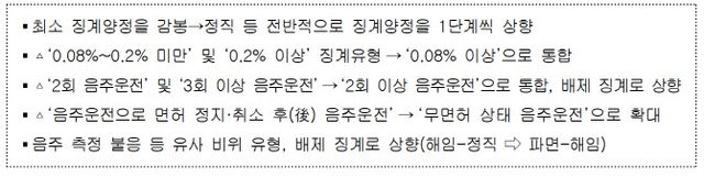 특히 술자리에 차량을 가지고 참석한 후 음주운전한 경우는 사실상 예비행위가 있던 것으로 봐 한 단계 더 높은 처분으로 대부분 배제 징계 되도록 했다. 음주운전 차량 동승 행위도 음주운전 방조로 무겁게 징계하도록 명시했다.