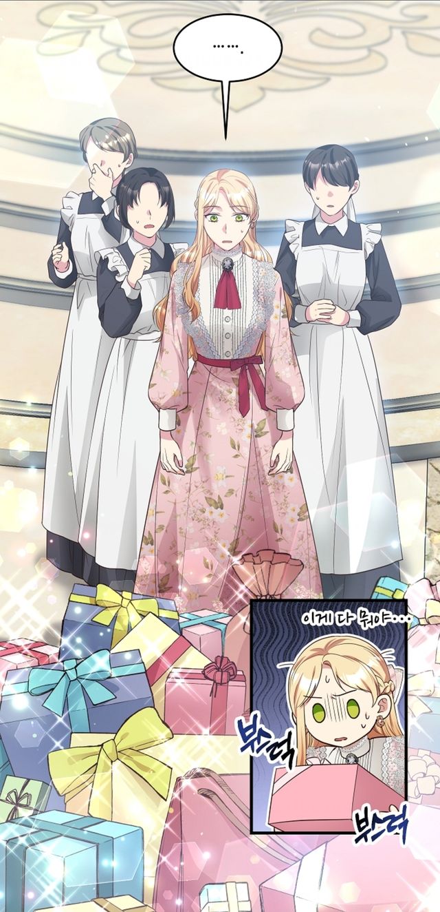 문 앞에 놓인 수많은 선물을 보며 공작이 말한 적절한 보상이 눈앞에 놓인 선물들이라는 것을 알게 되고 곤란해합니다.