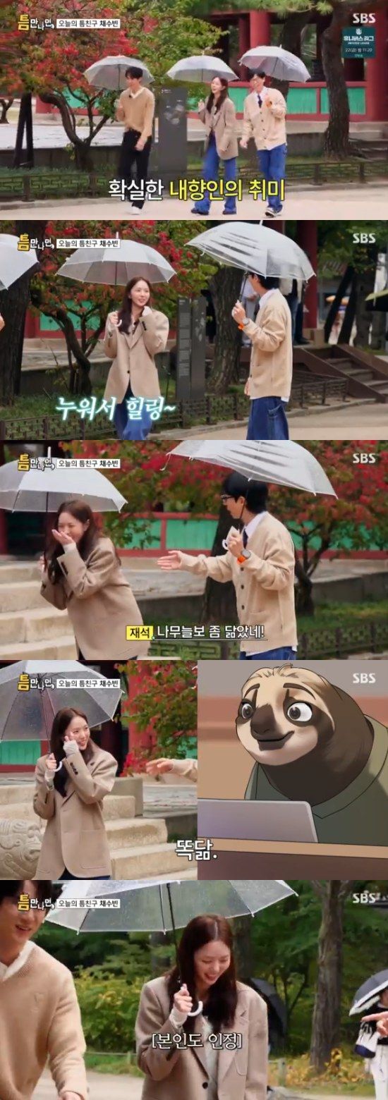 이에 유재석은 "그러고보니 '주토피아' 속 나무늘보를 닮았다"고 했고, 채수빈은 그런 말을 들어본 적이 있다고 인정하면서 "집에서 그냥 누워있다"고 다시 한 번 말해 웃음을 줬다.