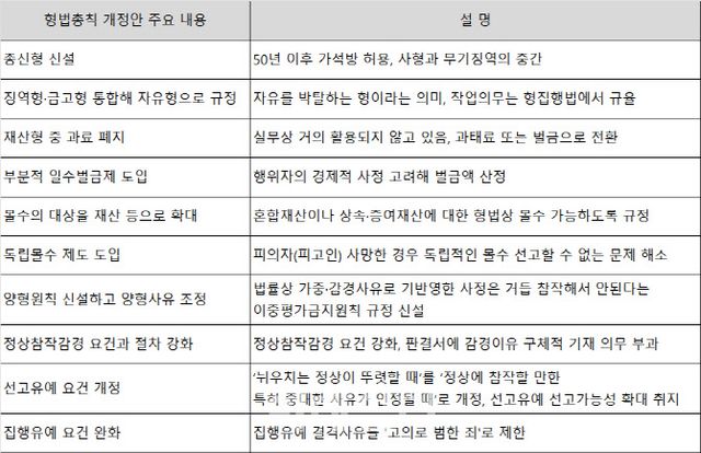 -이번 개정안에서 종신형 도입 제안, 사형제 존폐, 형사미성년자 연령 논의 등이 눈에 띈다.