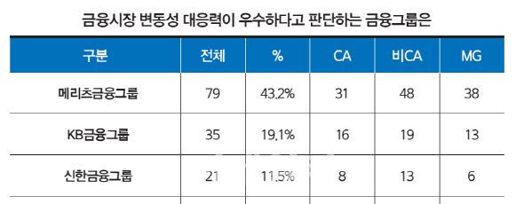 ESG 관리가 부실하다는 평가를 받은 메리츠금융그룹은 역설적으로 변동성 대응력 측면에서는 가장 우수하다는 평가를 받았다. 금융시장 변동성 대응력이 우수하다고 판단하는 금융그룹을 묻는 질문에서 전체 참여자 중 79명(43.2%)이 메리츠금융그룹을 뽑아 1위를 기록했다. 응답자를 직군별로 살펴보면 CA 31명, 비CA 48명이 메리츠금융그룹을 골랐다.
