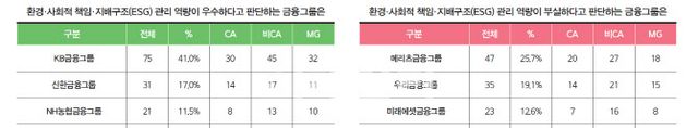 35회 신용평가 전문가 설문(SRE: Survey of credit Rating by Edaily)에서 시장 참여자들은 ESG 관리 역량이 우수한 금융그룹 1위로 KB금융그룹을 뽑았다. 2위와 3위에는 신한금융그룹과 NH농협금융그룹이 이름을 올렸다. ESG 역량이 부실하다고 판단되는 금융그룹에는 메리츠금융그룹이 1위를 기록해 불명예를 샀다. 2위와 3위는 각각 우리금융그룹과 미래에셋금융그룹이 꼽혔다.