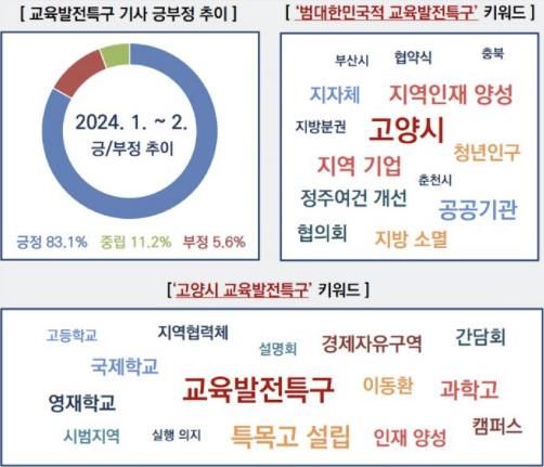 특히 ‘범대한민국적 교육발전특구’ 키워드를 검색했을 때 지역인재 육성, 지방 분권, 정주여건 개선 등 광범위한 교육 관련 주제가 연관 키워드로 나타난 반면 ‘고양시 교육발전특구’ 연관 키워드는 과학고, 영재학교, 특목고 설립 등 학교 설립에 집중됐다.