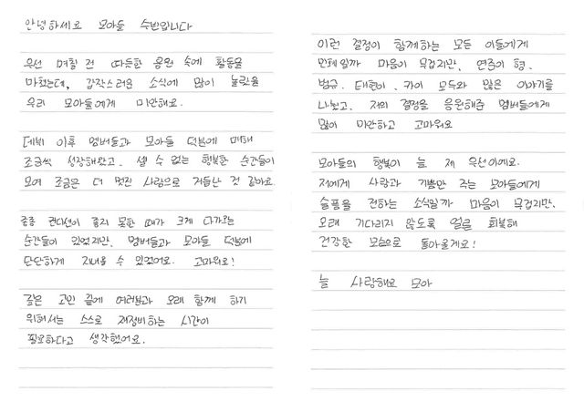 투모로우바이투게더 수빈이 활동 중단과 관련, 손편지를 전했다.
