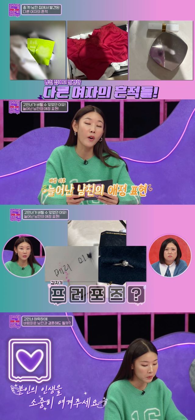 남자친구는 "다른 여자 만나보니까 알겠다. 난 너 아니면 안 된다"며 바람 피운 것을 사과한 뒤 청혼을 하며 패널들을 충격에 빠트렸다.