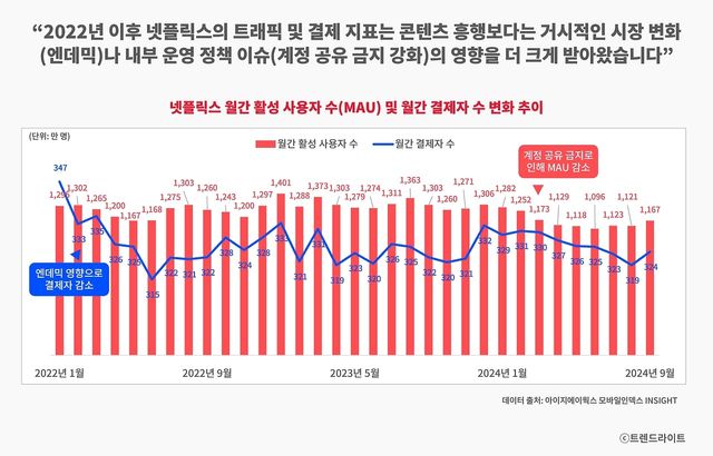 그렇다면 MAU는 왜 올해 들어 갑작스럽게 감소하면서 티빙에게 추격의 여지를 내주었을까요? 사실 넷플릭스의 MAU가 급감한 시점은 올해 2월 이후로, 이는 넷플릭스가 계정 공유 금지 조치를 모바일까지 확대하면서 발생한 현상입니다. 콘텐츠 흥행보다는 계정 공유 금지 같은 정책 변화가 사용자 수 감소에 더 큰 영향을 미친 셈입니다.