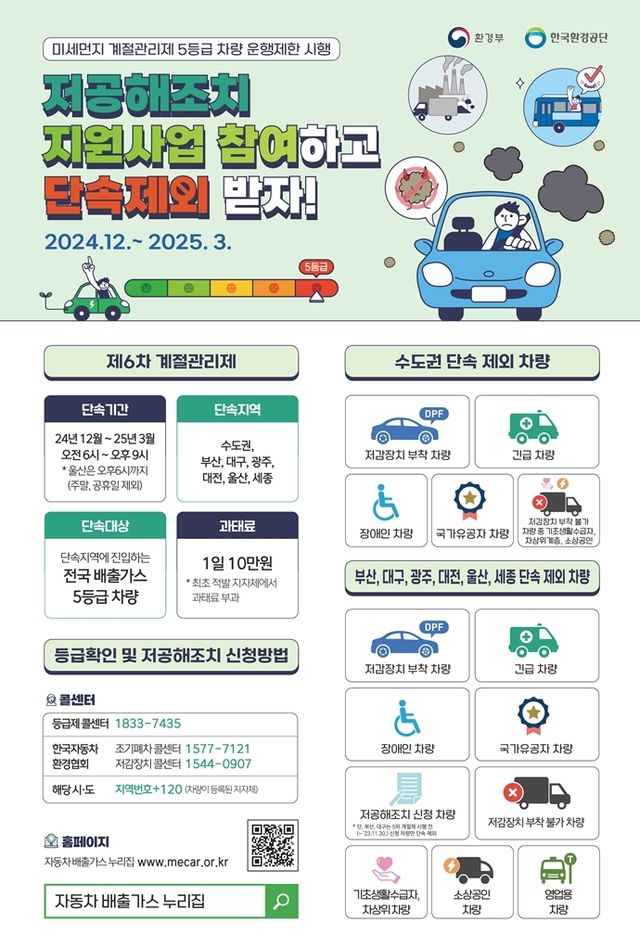 이번 제6차 단속 지역은 ‘수도권, 6대 특‧광역시(부산, 대구, 광주, 대전, 울산, 세종)’로, 단속 대상은 전국 17개 시‧도에 등록된 5등급 차량 전체다.