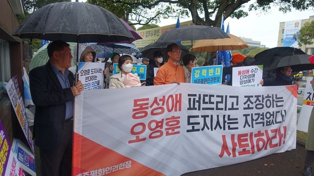이와 관련해 제주도민연대, 제주지킴이운동본부 등은 면담이 이뤄지는 동안 제주도청 앞에서 집회를 열고 "오영훈 도지사는 도민 의견을 무시하고 제정하려던 인권헌장을 당장 폐지하라"고 촉구했다.