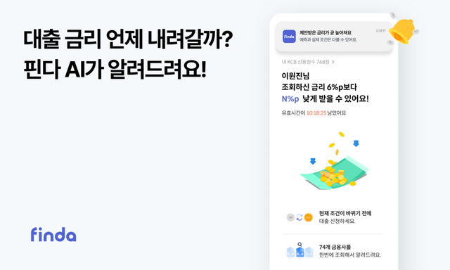 핀테크 기업 핀다(대표이사 이혜민·박홍민)가 업계 최초로 자사 AI 비교대출 플랫폼 핀다 앱을 통해 한도조회한 대출 상품의 금리 변동 가능성이 생기면 AI가 이를 감지해 사용자에게 알려주는 ‘금리 변동 예상 알림 서비스’를 선보였다고 20일 밝혔다.