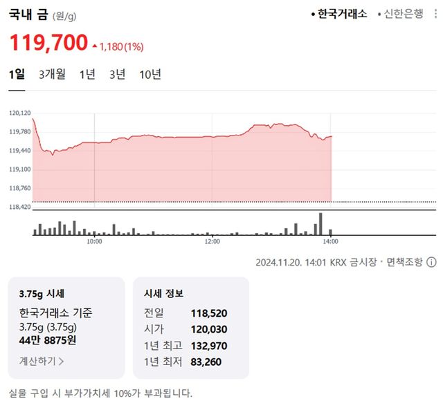 국내 금시세(금값)가 20일 오후 상승세(전 거래일 대비)를 보이고 있다.