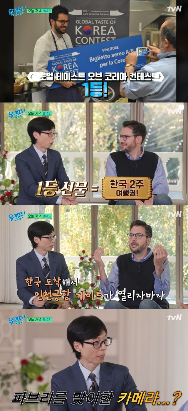 20일 tvN '유퀴즈 온더 블럭' 측은 본방송을 앞두고 '이탈리안 셰프 파브리, 처음 한국 오던 날 공항에서 마주한 의문의 카메라..?!'라는 제목의 영상을 선공개했다.