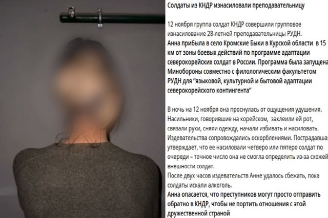 피해자 여성 A씨는 러시아민족우호대학(RUDN)에 다니는 28세 대학생으로, 파병 북한군의 현지 적응을 돕기 위해 전장에 참여한 것으로 전해졌다.
